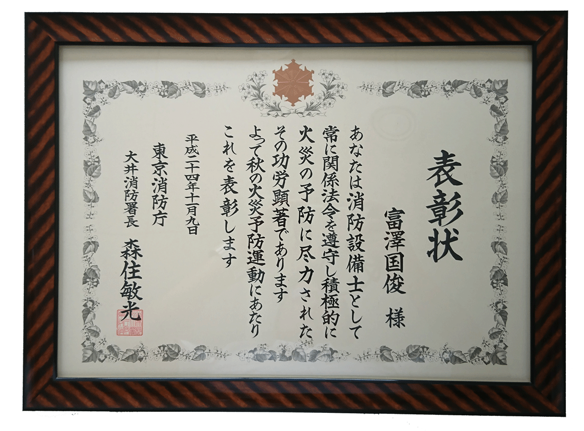 | 所属職員技術資格 | 東京都消防庁 消防設備士(甲種4類) |