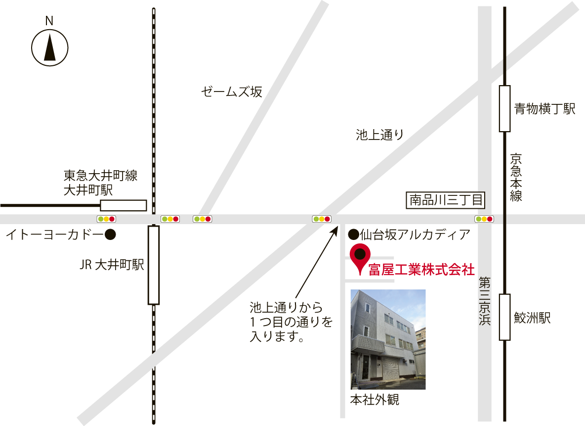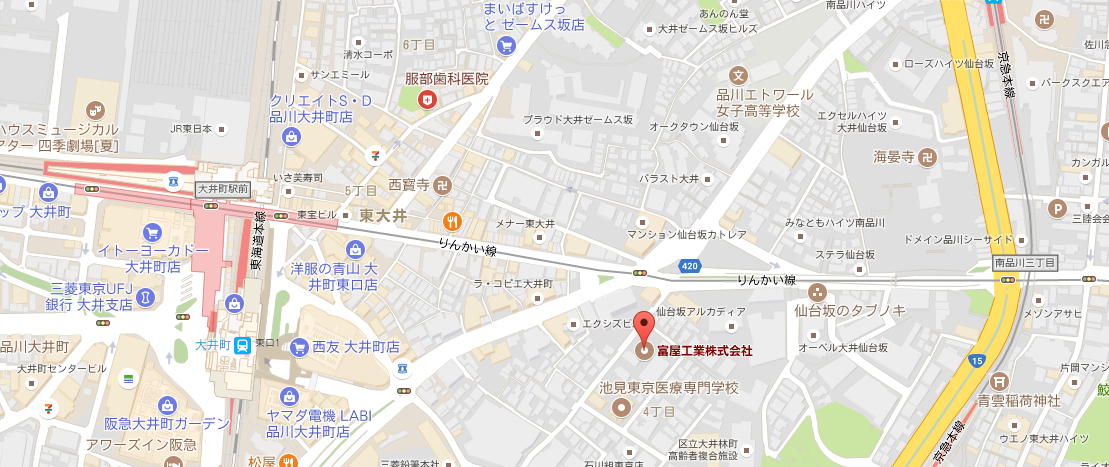 富屋工業株式会社〒140-0011 東京都品川区東大井4丁目12番17号TEL 03-5461-1351(代)京急本線 鮫洲駅から徒歩10分京急本線 青物横丁駅から徒歩10分JR京浜東北線 大井町駅から徒歩10分東急大井町線 大井町駅から徒歩10分 ページトップへ